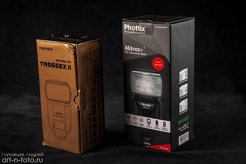 Упаковка производит хорошее впечатление качественным картоном и полиграфией. Для сравнения, рядом упаковка с Yongnuo speedlite YN-565EX II: